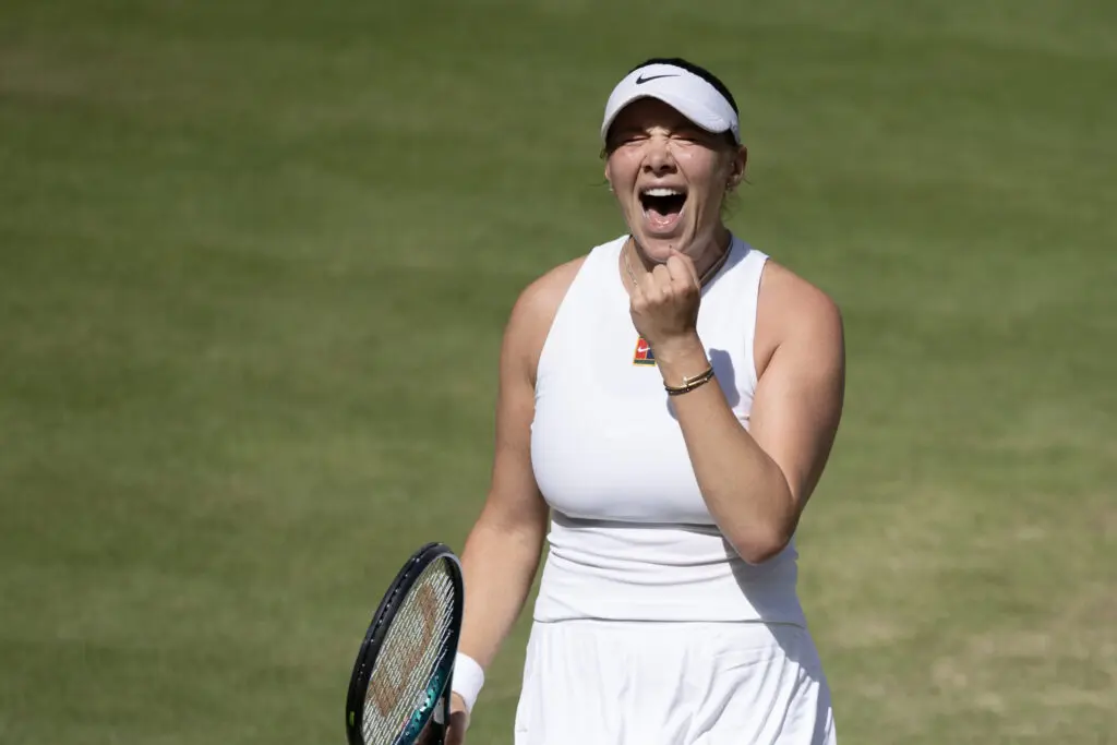 Amanda Anisimova celebrates a victory during a 2025 tennis match on grass court