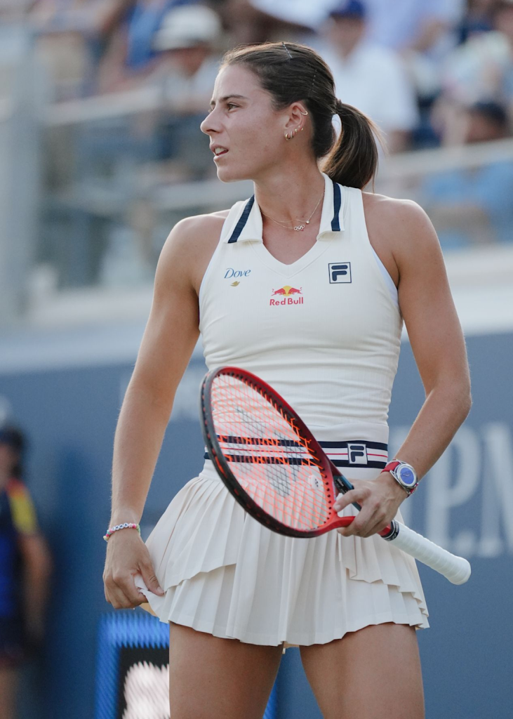 Emma Navarro, professional tennis player, during a match, holding a tennis racket and acknowledging the crowd